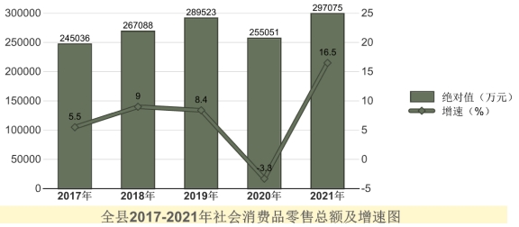 全年全縣社會消費品零售總額297074.5萬元,同比增長16.5%。按經營地統計,城鎮消費品零售額176559.5萬元,同比增長17.4%;鄉村消費品零售額120515.0萬元,同比增長15.2%。按消費形態統計,餐飲收入17329.6萬元,同比增長27.2%;商品零售279744.9萬元,同比增長15.9%。