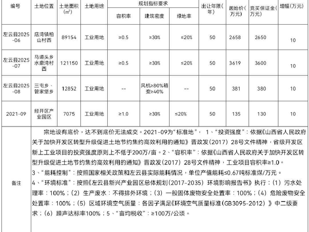 掛牌時間為:左云縣2025-06號地塊:2025年11月3日9時00分至2025年11月17日11時00分;左云縣2025-07號地塊:2025年11月3日9時00分至2025年11月17日11時00分;左云縣2025-08號地塊:2025年11月3日9時00分至2025年11月17日11時00分;2021-09號地塊:2025年11月3日9時00分至2025年11月17日11時00分;
